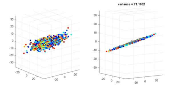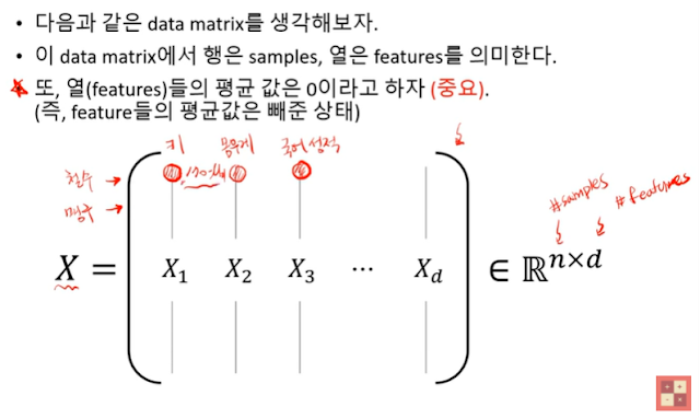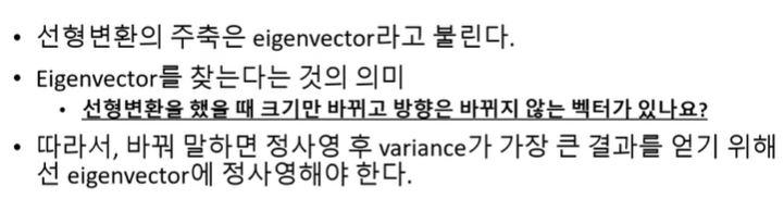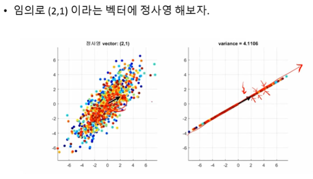 - 데이터의 구조를 잘 살려주면서 차원감소하기위해선 정사영 후의 데이터 분포의 분산이 가장 큰 것이 좋다.