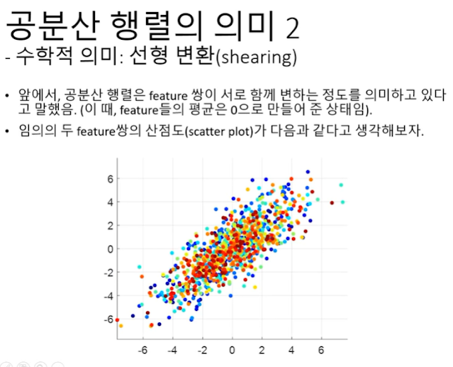 대각행렬은 분산처럼 역할을 하며, 대각행렬이 아닌 부분은 공분산 처럼 된다.