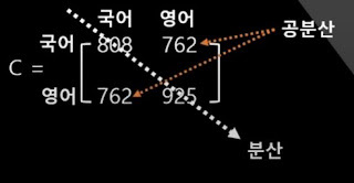 영어와 영어의 분산은 공분산이고, 국어와 국어의 분산은 공분산이 된다.