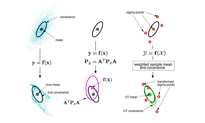 The confidence ellipses and mean values obtained in a process of sampling (reference), EKF and UKF approximations (source: “The Unscented Kalman Filter for Nonlinear Estimation”, Eric A. Wan and Rudolph van der Merwe)