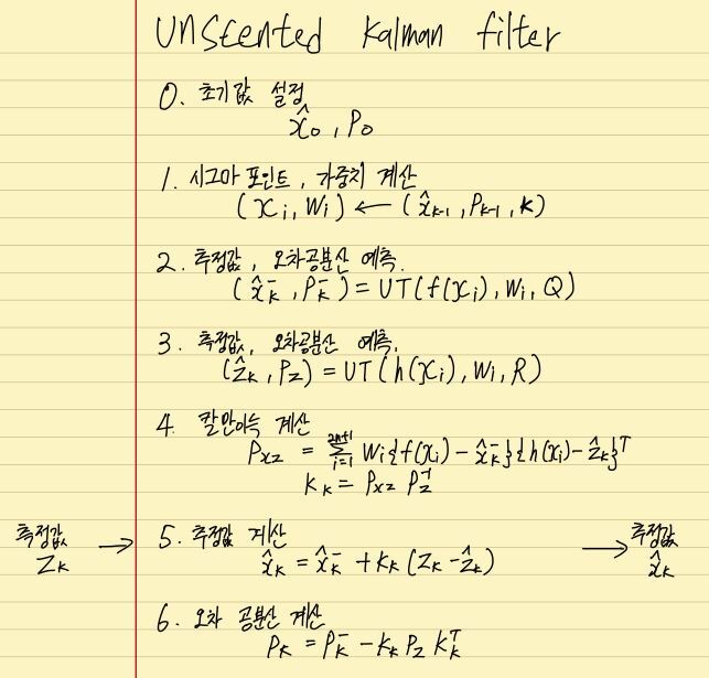 기존 칼만필터 알고리즘에서 시스템모델의 예측이 필요한 곳에서 UT가 사용된다.